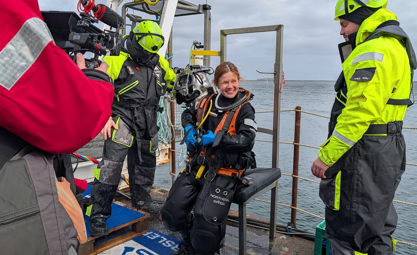 Men indtil da fortsætter dykkerarbejdet, og Julie Hultén, der netop har siddet og taget billeder på kontoret, overtager nu undervandskameraet og den tunge hjelm for at køre 16 meter ned i dybet.