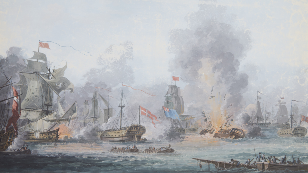 Sådan så slaget og Dannebroges undergang ud ifølge Gustaf Boberg. (Malerie: 'Slaget på reden', tilskrevet Gustaf Boberg / Statens Museum for Kunst)