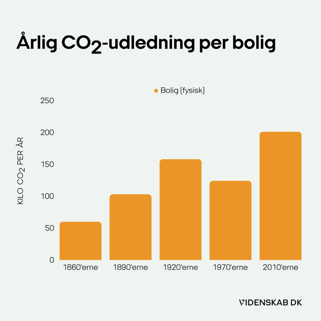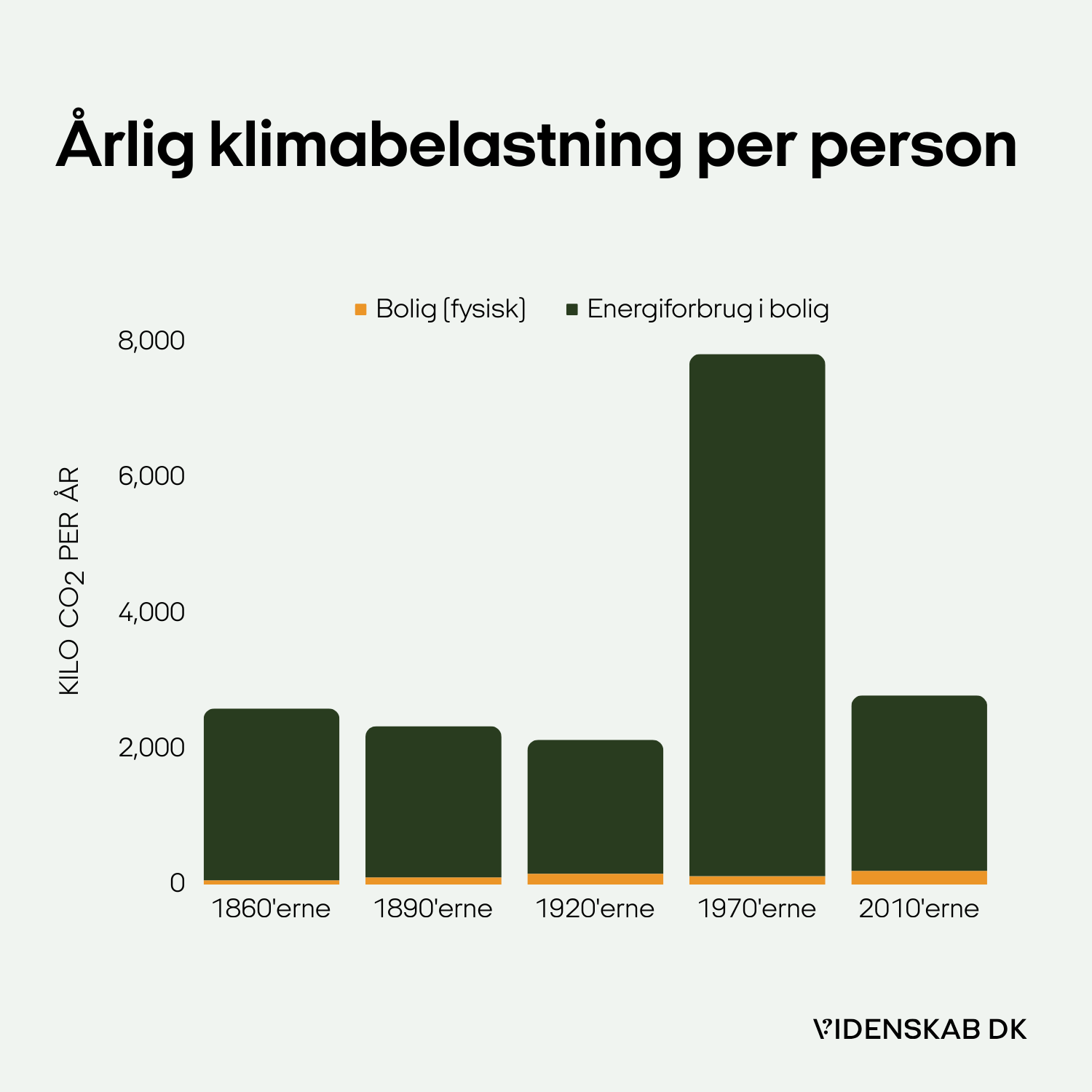 Vores resultater (som jeg i skrivende stund er i gang med at udgive videnskabeligt) giver et plausibelt bud på, hvordan danskernes klimabelastning har set ud tilbage i historien. Når vi kigger på boligen, deles den op i to dele: