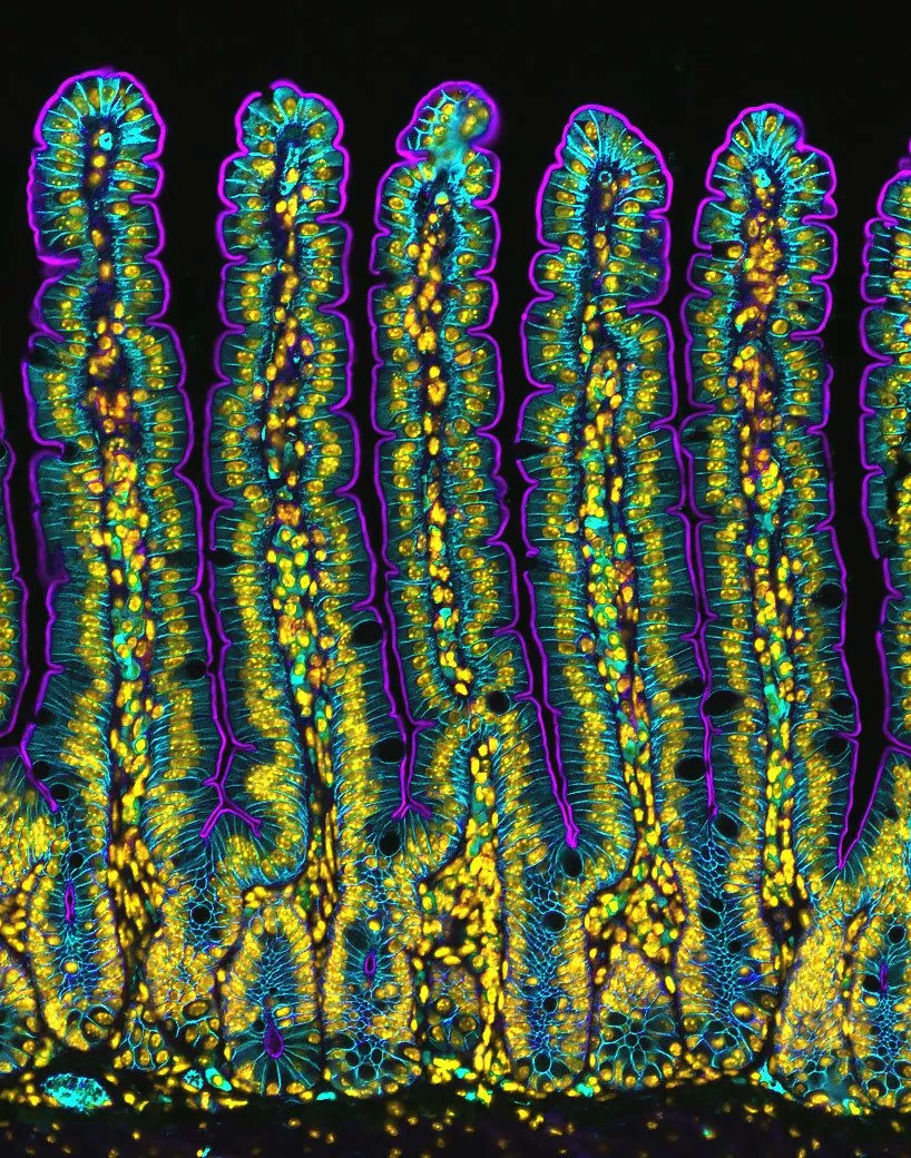 Selvom billedet godt kunne ligne mangefarvede orme eller måske dybhavsplanter, er det i virkeligheden et nærbillede af tyndtarmen på en mus.