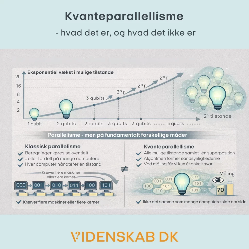 Kvanteparallellisme er altså ikke det samme som at have mange konventionelle computere kørende side om side. Det er et matematisk værktøj, som kun giver en fordel, når algoritmen er nøje designet til at styre sandsynlighederne på den rigtige måde.